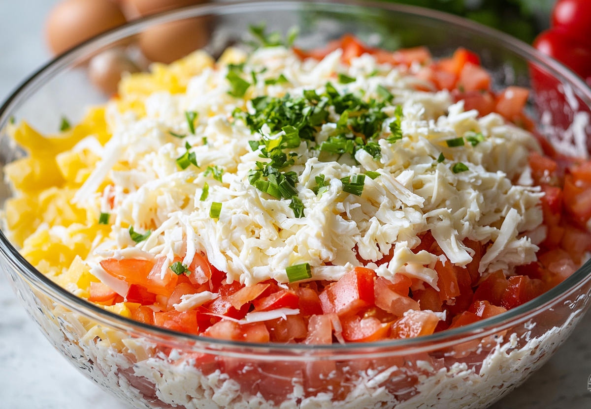 Слоеный салат с крабовыми палочками и болгарским перцем — отличный вариант простого блюдо с ярким вкусом. Если оставить салат в холодильнике на несколько часов, овощной сок пропитает все ингредиенты, и салат станет очень сочным!