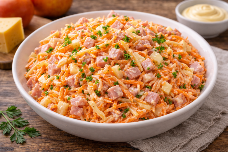 Этот салат — один из тех простых рецептов, которые неожиданно становятся любимыми. Казалось бы, обычные продукты, а вместе дают очень удачное сочетание вкусов. Хрустящая свежая морковь и сочное яблоко добавляют легкости и свежести, ветчина делает салат сытным, а сыр мягко связывает все ингредиенты. Немного чеснока и майонеза — и вкус становится ярким, с приятной пикантной ноткой.