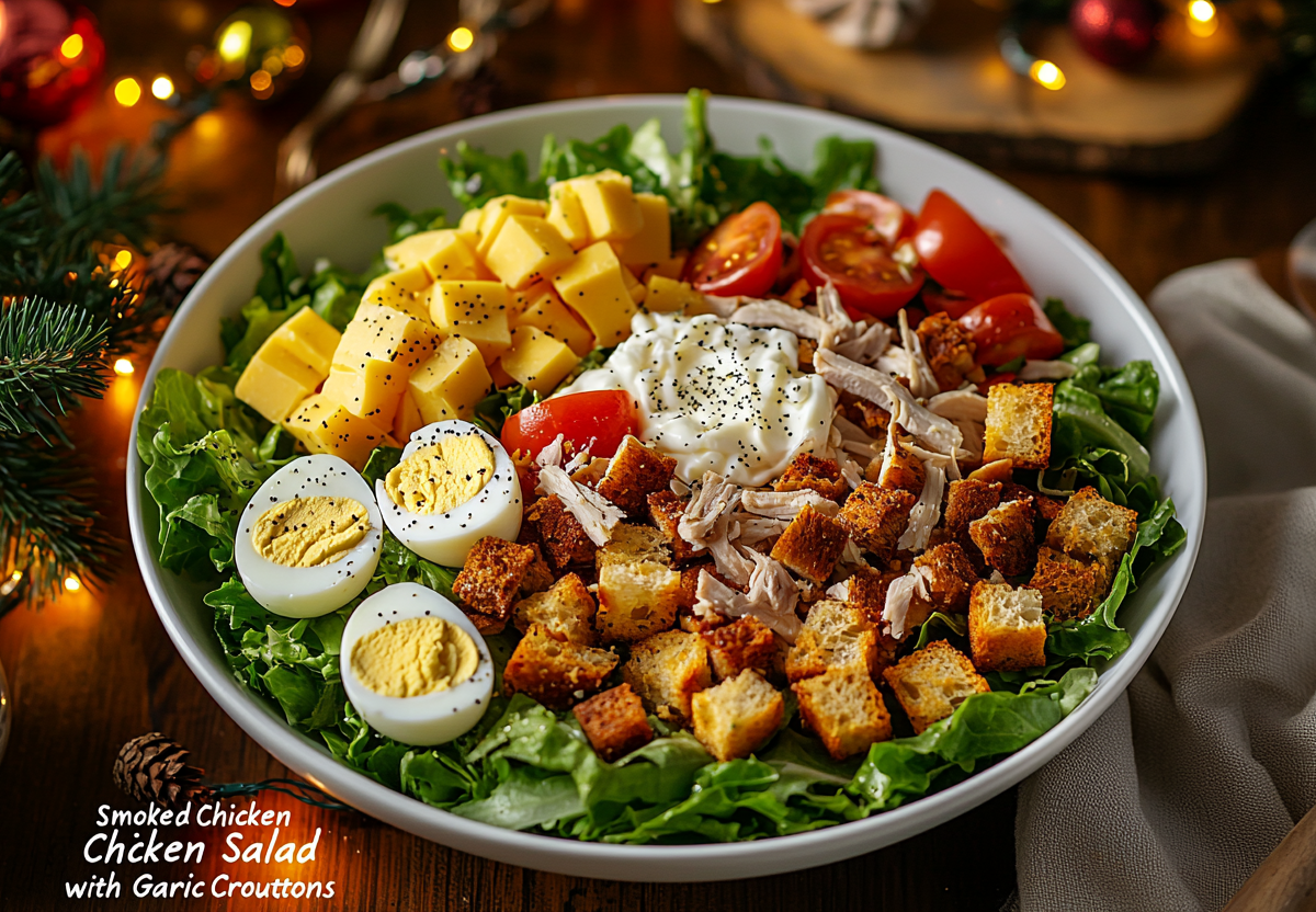 Ингредиенты: копченая курица (филе или окорочок, 300 г), яйца вареные (3-4 шт.), помидоры (2 шт.), твердый сыр (100–150 г), листья салата айсберг, хлеб для гренок (2-3 ломтика), чеснок (2-3 зубчика), подсолнечное масло, майонез, паприка, соль, перец, мак для украшения.