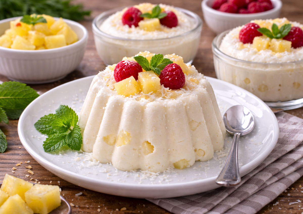 Приготовление: желатин разводят в молоке и оставляют на 20 минут для набухания. Творог соединяют с сахарной пудрой, сметаной и ванильным сахаром, взбивают до пышной массы. Ананас нарезают небольшими кусочками. Набухший желатин нагревают до полного растворения, не доводя до кипения. Тонкой струйкой вливают в творожную массу, постоянно помешивая. Добавляют фрукты и аккуратно перемешивают. Массу выкладывают в форму или порционные стаканы и убирают в холодильник на 4–5 часов до застывания. Перед подачей форму можно на несколько секунд опустить в горячую воду — десерт легко выйдет.