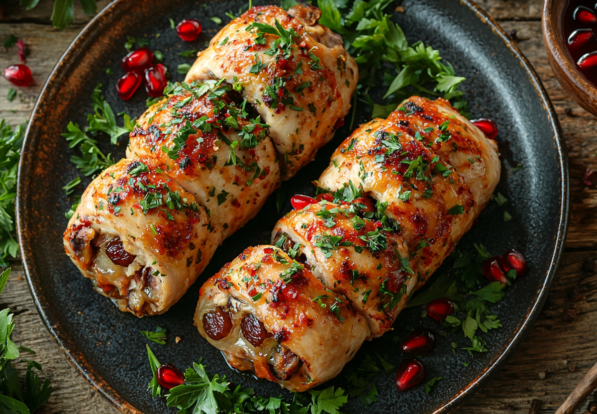 Выпекайте в разогретой до 180 °C духовке 25–30 минут под фольгой, затем 5 минут без нее — для румяной корочки. Подавайте с гранатовым соусом и зеленью.