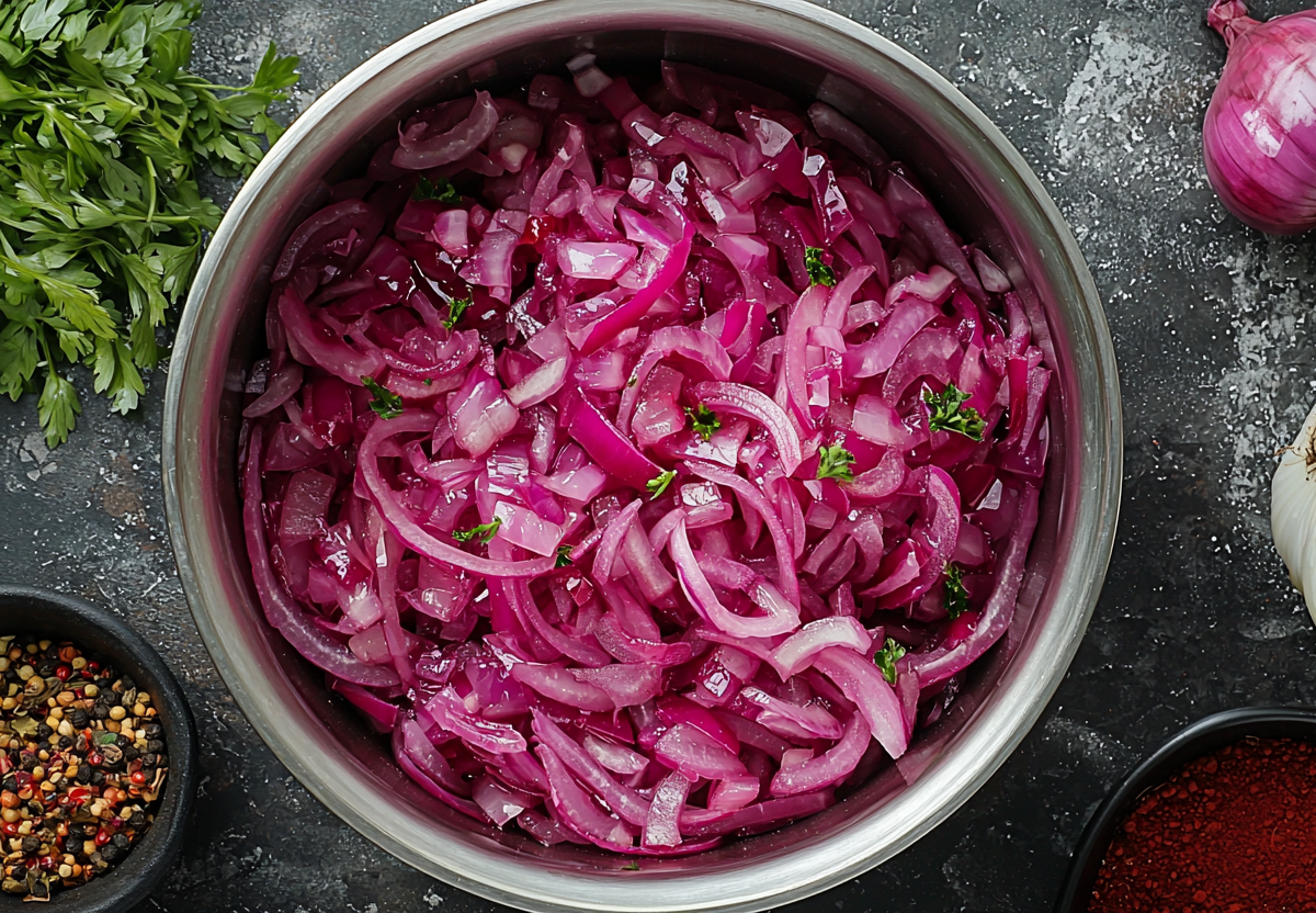 Готовим маринованный лук — король мясных закусок! Этот простой рецепт превращает обычный лук в шедевр, который затмевает даже сам шашлык! Секрет — в особом маринаде, который смягчает резкость лука, раскрывая его сладковатую нотку.