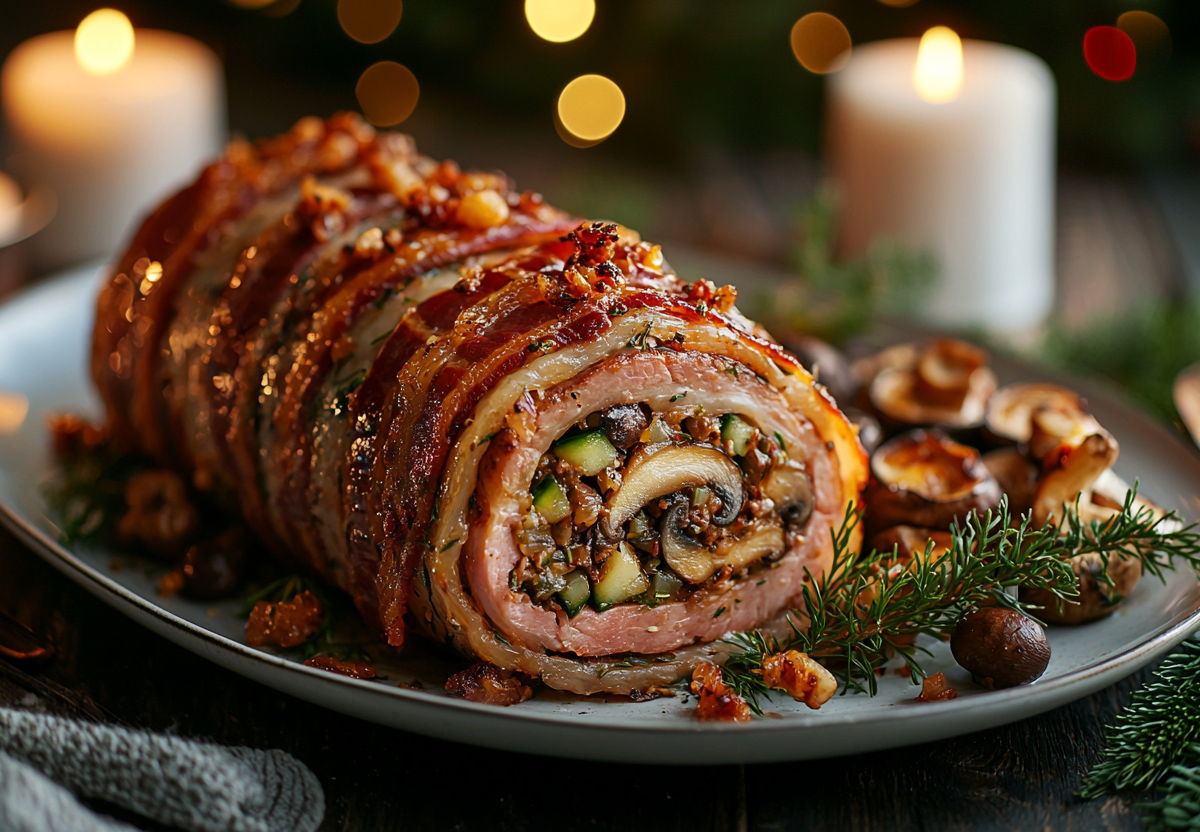 Вам понадобится: 800 г свиной вырезки или корейки, 200 г бекона, 150 г творожного сыра, 200 г шампиньонов, 2 соленых огурца, специи для мяса, соль, перец, растительное масло, пищевая пленка. Мясо нарежьте вдоль широким пластом, отбейте, посолите и поперчите. На стол расстелите пленку или фольгу, выложите на нее ломтики бекона внахлест. Сверху поместите мясо. Равномерно смажьте его творожным сыром. Грибы нарежьте и обжарьте до готовности, остудите. Соленые огурцы натрите на крупной терке. Выложите грибы и огурцы поверх сыра. С помощью пленки плотно сверните рулет. Выпекайте 40–50 минут при 180 °C, затем разверните пленку и запекайте еще 10–15 минут для румяной корочки. Дайте мясу отдохнуть 15 минут перед нарезкой.