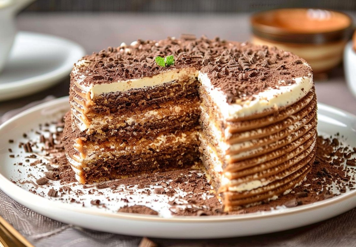 В мире десертов есть настоящие легенды, которые передаются из поколения в поколение, и армянский торт «Микадо» — одна из них. Этот торт не просто сладкое угощение, а целое событие, многогранный шоколадный опыт, который покоряет с первого кусочка. Он входит в золотую коллекцию советской и постсоветской кухни наравне с «Наполеоном» и «Птичьим молоком» — и не зря. Его основа — насыщенные, почти коричневые бисквитные коржи, пропитанные до состояния бархатной влажности, и невероятно пышный, воздушный крем на основе вареной сгущенки и сливочного масла. Вкус у него глубокий, шоколадный, но при этом не приторный, а текстура настолько нежная, что он буквально тает во рту. Это торт для тех, кто ценит в десертах характер, основательность и щедрость.
