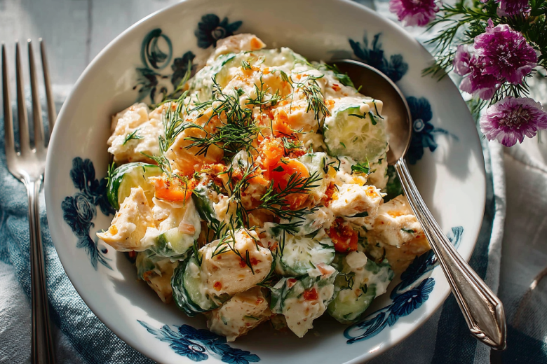 Вкус салата — это гармония контрастов: сочная, но нежная курица, хрустящие и кисловатые маринованные огурчики, сладковатая отварная морковь и сливочно-яичная заправка с яркой ноткой свежего укропа.