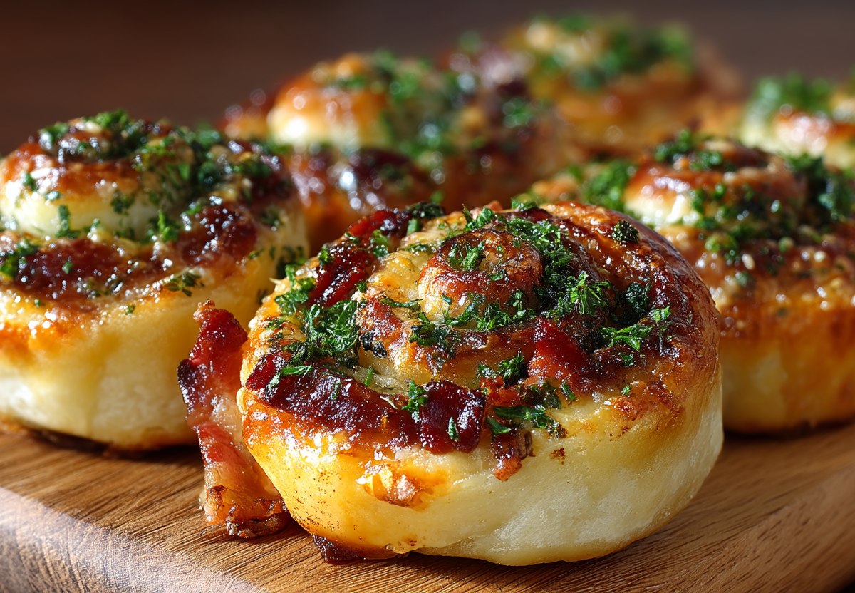 Получается обалденная вкуснятина: нежное, слоистое тесто с золотистой корочкой, а внутри — сочный бекон, тягучий расплавленный сыр, ароматный томатный соус и свежая нотка зелёного лука.