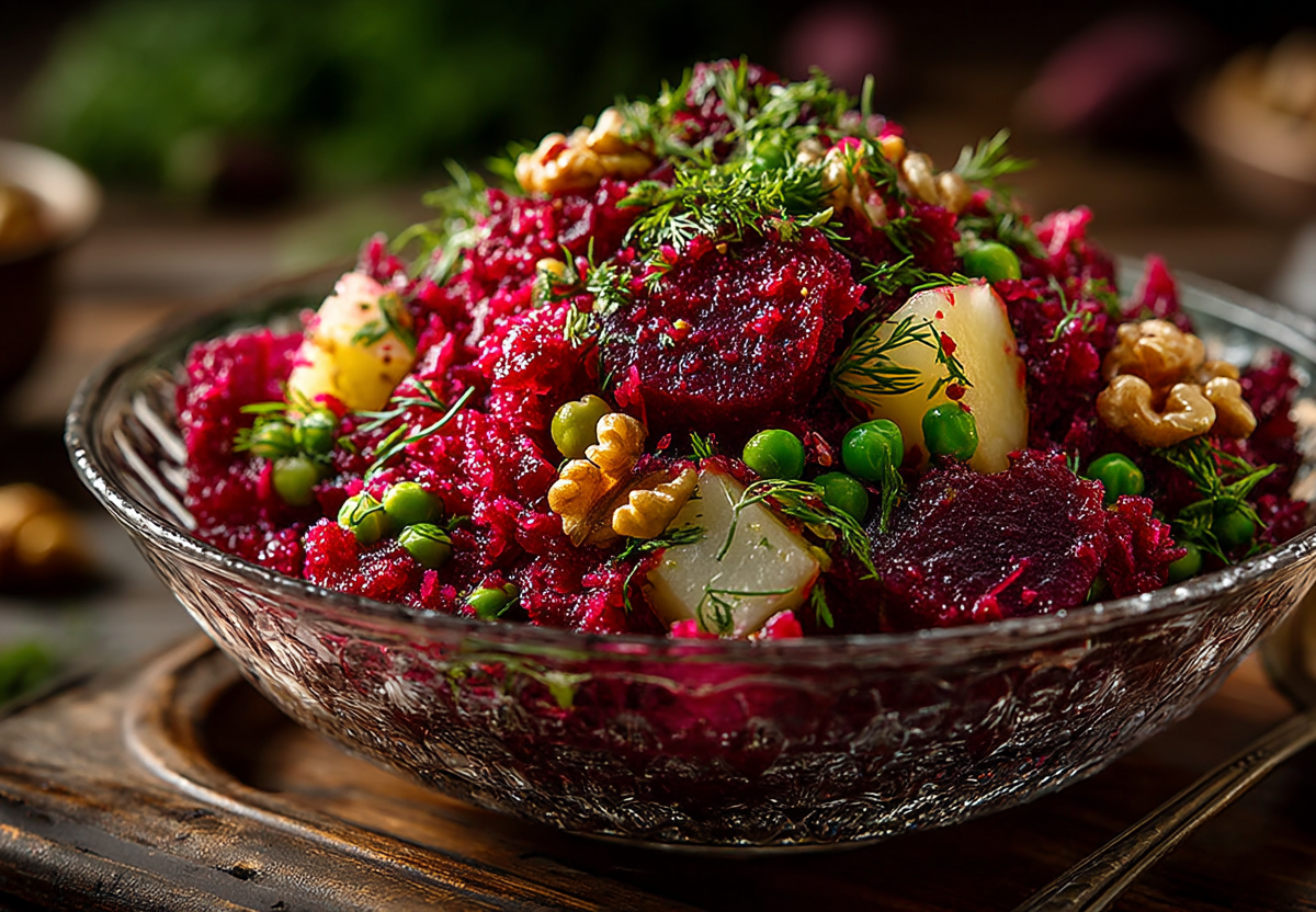 Сочетание сладковатой свеклы, кисло-сладкого яблока, нежного горошка, хрустящих орехов и пикантного чеснока в масляной заправке создает яркий вкус. Вкуснее винегрета!
