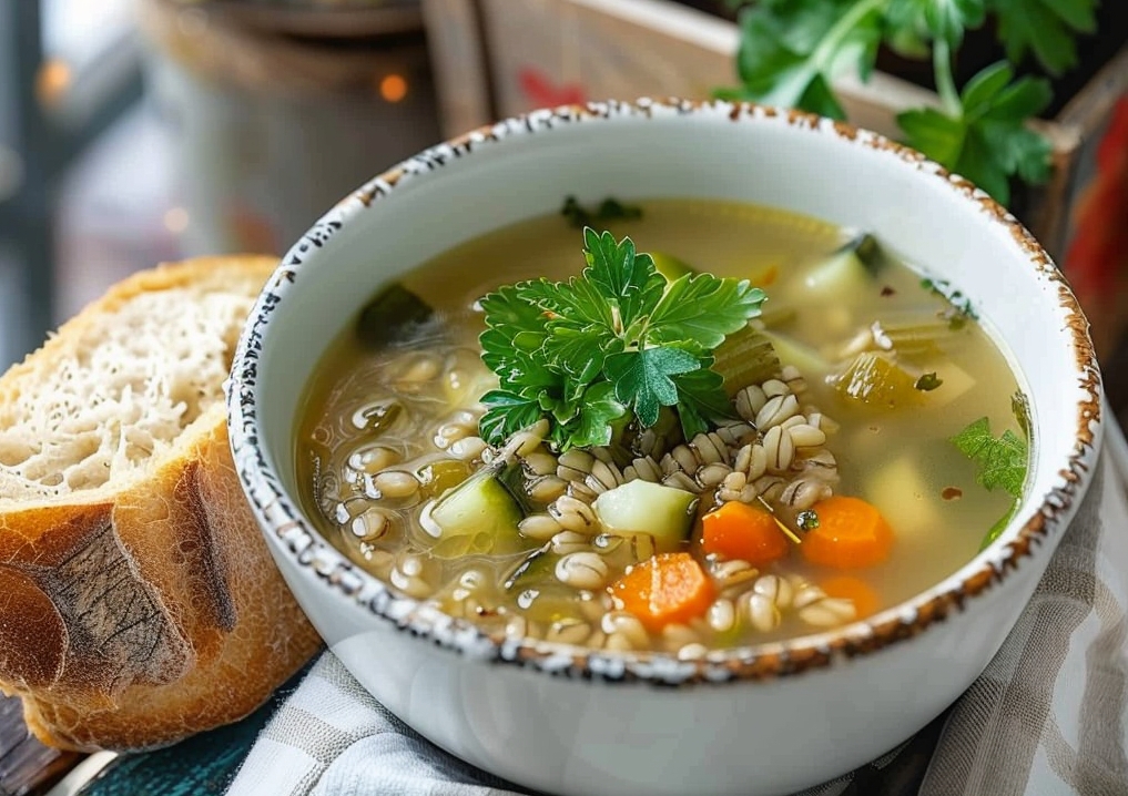 Проверить готовность перловки, при необходимости слить лишнюю воду из кастрюли и переложить туда содержимое сотейника. Довести суп до кипения, поварить 5–7 минут, затем выключить и оставить доходить на горячей конфорке на полчаса. После этого диетический постный рассольник можно подавать к столу.