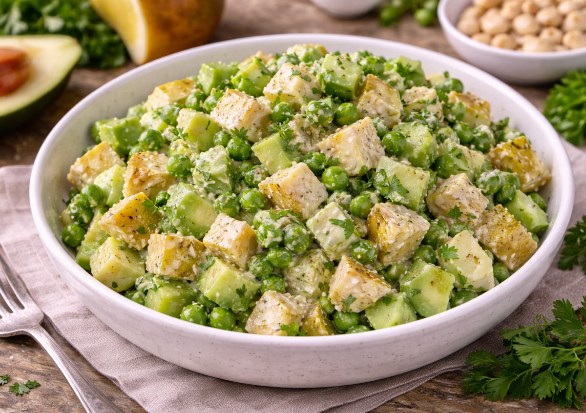 Для приготовления вам понадобится: 1 большой огурец, 150 г зеленого горошка, 1 крупная груша сорта «конференция», 1 среднее авокадо, 60 г кешью, 60 мл воды, 10 мл лимонного сока, 1 ч. л. зерен горчицы, соль по вкусу. Огурец, грушу и авокадо нарежьте аккуратными кубиками, горошек заранее отварите и остудите. Для заправки кешью, воду, лимонный сок, замоченные зерна горчицы и соль взбейте блендером до гладкого кремового соуса. Соедините овощи и фрукты в миске, добавьте соус и аккуратно перемешайте. Подавайте сразу, пока салат максимально свежий и хрустящий.