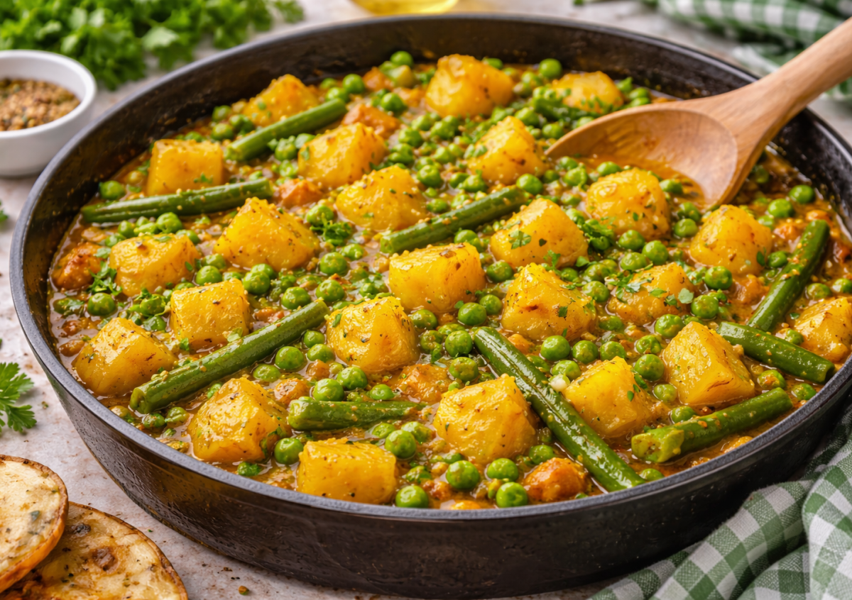 Нежный картофель, зеленый горошек и фасоль в пряном соусе со специями создают гармоничное сочетание вкусов. Блюдо подходит для поста, правильного питания и тех дней, когда хочется легкой, но сытной еды.
