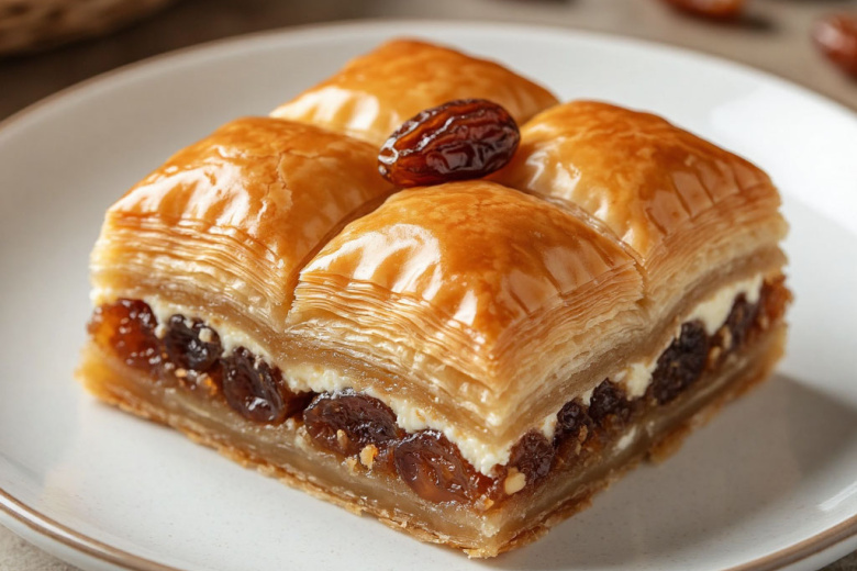 Для теста замесите 400 г муки, 1 яйцо, 100 г растопленного сливочного масла, 100 г сметаны и щепотку соли, дайте отдохнуть 30 минут. Для начинки смешайте 400 г творога, 150 г измельченных фиников без косточек и 100 г сахара. Разделите тесто на 8 частей, каждую тонко раскатайте. Форму смажьте маслом. Выкладывайте слои: 4 листа теста, смазанные растопленным маслом, творожная начинка, затем оставшиеся 4 листа теста, также смазанные маслом. Нарежьте пахлаву ромбиками, запекайте 40 минут при 180 °C до золотистости. Приготовьте сироп из 200 г меда и 100 мл воды, доведите до кипения. Горячую пахлаву сразу залейте сиропом. Дайте полностью остыть и пропитаться не менее 4 часов.