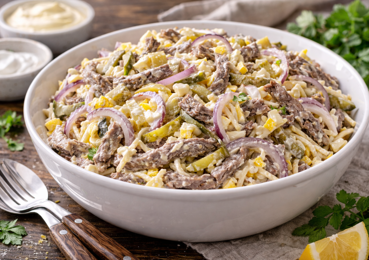 Приготовление: отварную говядину нарежьте тонкой соломкой и слегка разберите волокна вилкой — так салат будет особенно нежным. Маринованные огурцы нарежьте соломкой, красный лук — тонкими полукольцами. Сыр и варёные яйца натрите на крупной тёрке. Сложите все ингредиенты в глубокую миску, добавьте сметану и майонез, аккуратно перемешайте. Солить не нужно — сыра и огурцов вполне достаточно. Дайте салату постоять 15–20 минут в холодильнике — вкус станет ещё более насыщенным. Такой салат всегда выручает, когда хочется вкусного без лишних хлопот.