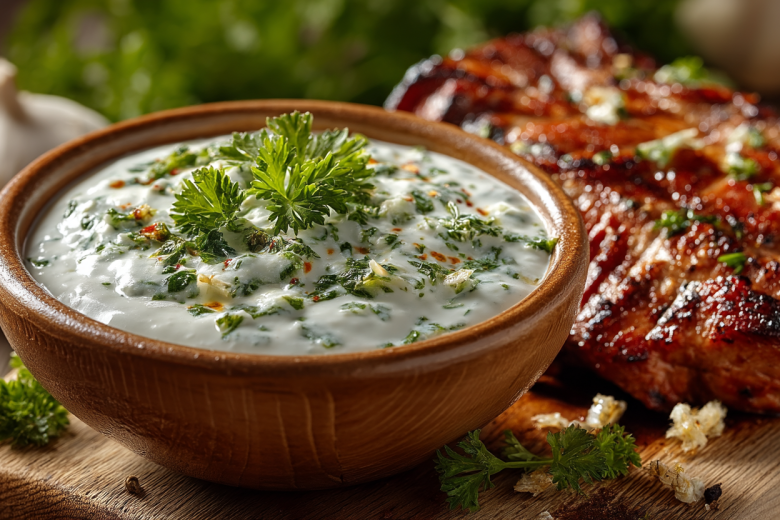 Получается обалденная вкуснятина: густой кремовый соус с легкой остринкой аджики, чесночным ароматом и свежей ноткой петрушки, который подчеркивает вкус мяса и делает его еще сочнее.