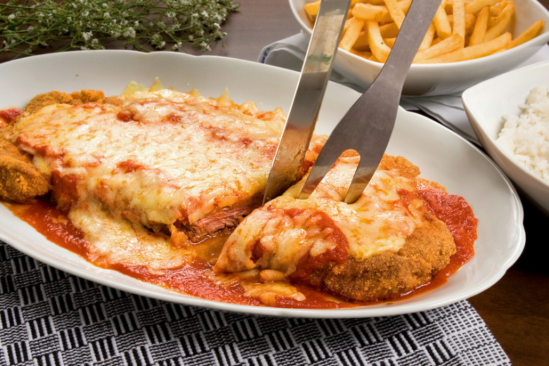 Возьмите следующие ингредиенты: куриная грудка (2 шт.), панировочные сухари (100 г), яйцо (1 шт.), томатный соус (3 ст. л.), сыр (50 г), соль, перец по вкусу.