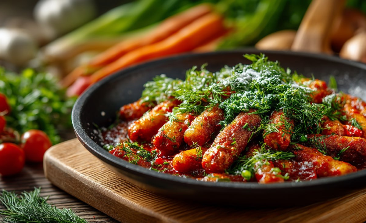 Нежные, сочные палочки из фарша обжариваются до румяной корочки, а затем тушатся в ароматном томатном соусе до загустения. Вкус получается очень насыщенным.