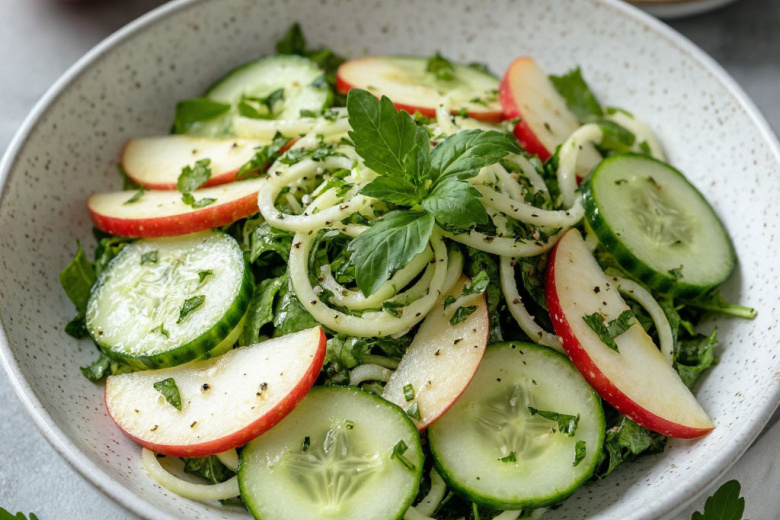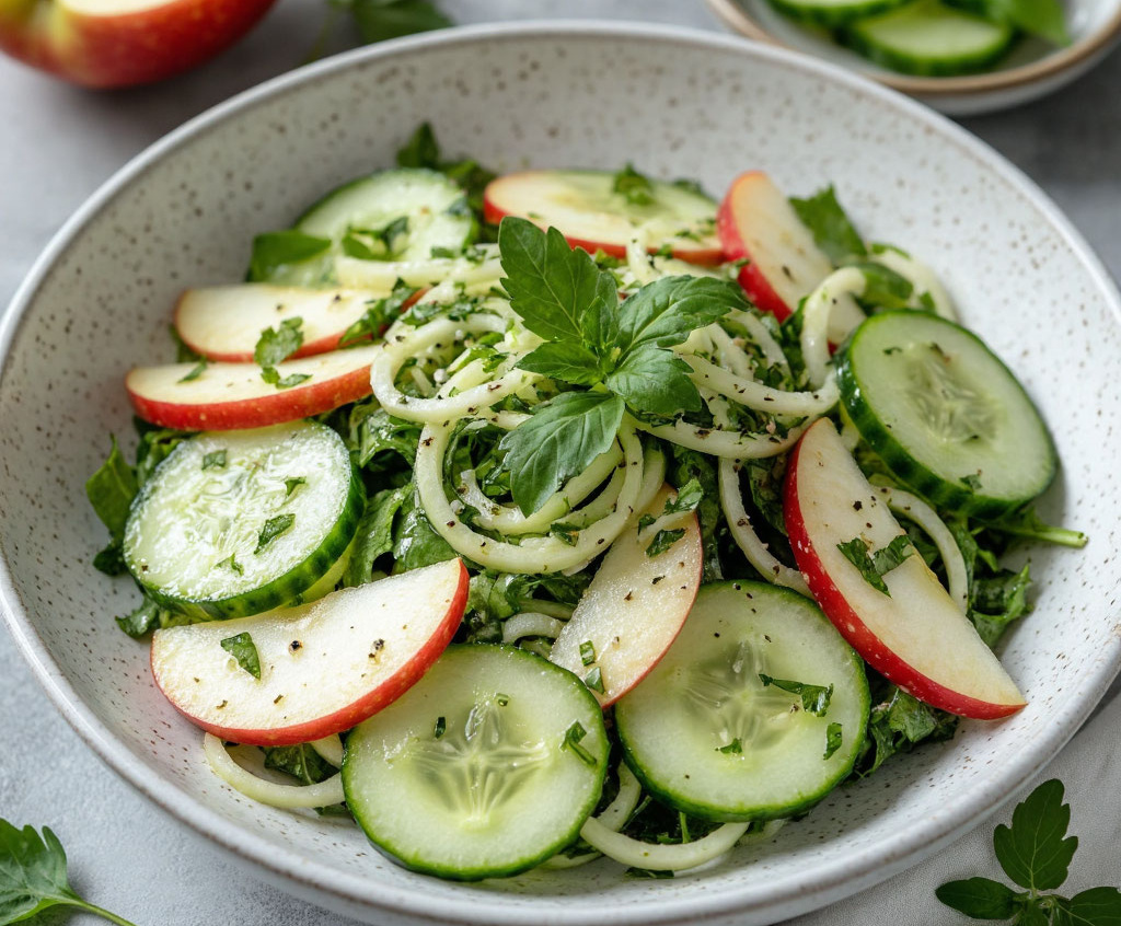 Весна пришла — за 5 минут готовлю салат «Газапхули» с яблочком, огурцом и самой сочной заправкой. Беру свежий огурец, зеленое яблоко и ароматную зелень — и создаю легкий, витаминный салат, идеальный для поста или как освежающее дополнение к любому блюду. Это гениально простое и невероятно вкусное блюдо, которое готовится быстрее, чем вы сварите макароны. Его необычность в том, что кисло-сладкое яблоко и хрустящий огурец в компании чеснока и лимонного сока создают тот самый весенний, пробуждающий вкус. Получается обалденная вкуснятина: сочная, хрустящая, с легкой кислинкой и пикантной ноткой чеснока. Салат идеально подходит к шашлыку, жареной картошке или просто как самостоятельная закуска.