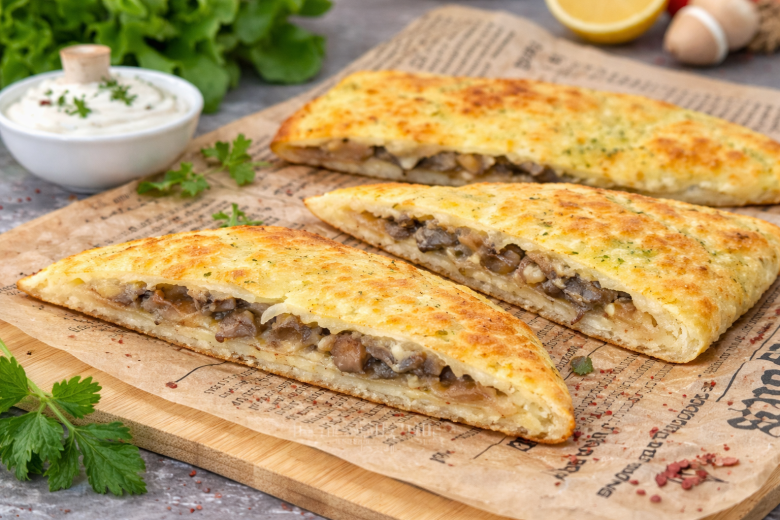 Посыпьте тертым сыром, на одну половину каждого пласта выложите грибы и аккуратно сложите пополам с помощью пергамента. Переложите на противень и запекайте при 180 °C 15–20 минут до легкой румяной корочки. После запекания снимите пергамент, нарежьте порционно и подавайте горячими, лучше всего со сметаной.