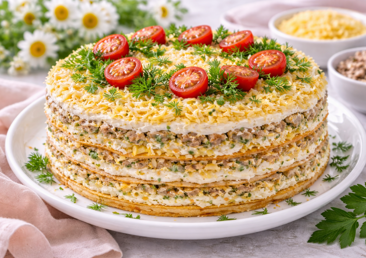 Когда хочется удивить гостей, но без многочасовой готовки, этот торт-салат становится настоящей находкой. Нежные слоеные коржи, сочная рыбная начинка, яйца и сыр — все вместе превращается в эффектную и очень вкусную закуску для праздничного стола. Готовится из самых доступных продуктов, выглядит как торт, а на вкус — лучше многих салатов. Отличная альтернатива привычной «Мимозе».