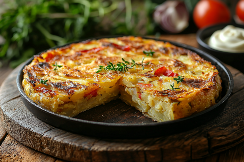 Картофель очищаю и нарезаю тонкими ломтиками. Замачиваю в холодной воде на 10 минут — так уходит лишний крахмал. Обсушиваю полотенцем и обжариваю на оливковом масле 25 минут на среднем огне до мягкости и легкой румяности. Лук мелко шинкую и пассерую до прозрачности — он добавляет сладковатую нотку. Яйца взбиваю венчиком с солью и перцем до однородности.