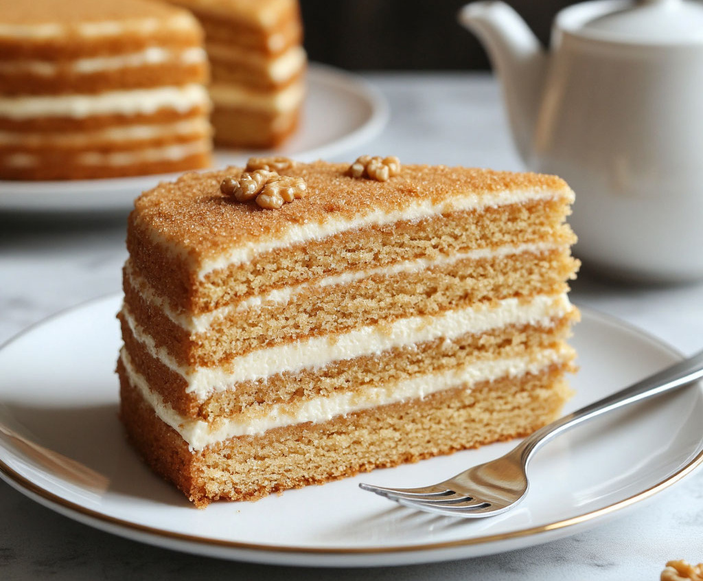 Вместо «Наполеона» — торт из детства. Медовик «Как у бабушки»: тонкие коржи, пропитанные медовым сиропом, и легкая сметана. Это душевно простое и невероятно вкусное блюдо, идеальное для самого теплого домашнего чаепития.