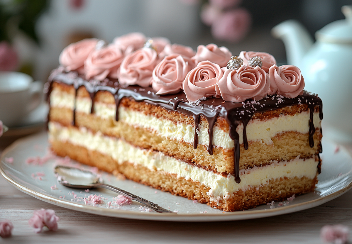 Рецепт: для бисквита вам понадобится 4 яйца, 150 г сахара, 130 г муки, щепотка соли, 1 ч. л. ванилина. Для масляного крема: 200 г сливочного масла (комнатной температуры), 150 г сахарной пудры, 2–3 ст. л. сгущенного молока, ванилин. Для шоколадного ганаша: 100 г темного шоколада, 100 мл жирных сливок (33%).