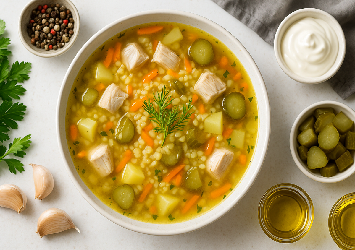 Готовим рассольник с курицей и булгуром — сытное обновление классического рецепта! Этот ароматный суп сочетает традиционный вкус рассольника с питательной пользой булгура. Нежная куриная грудка, хрустящие огурцы и золотистая крупа создают гармоничный ансамбль, который согреет в любой день.