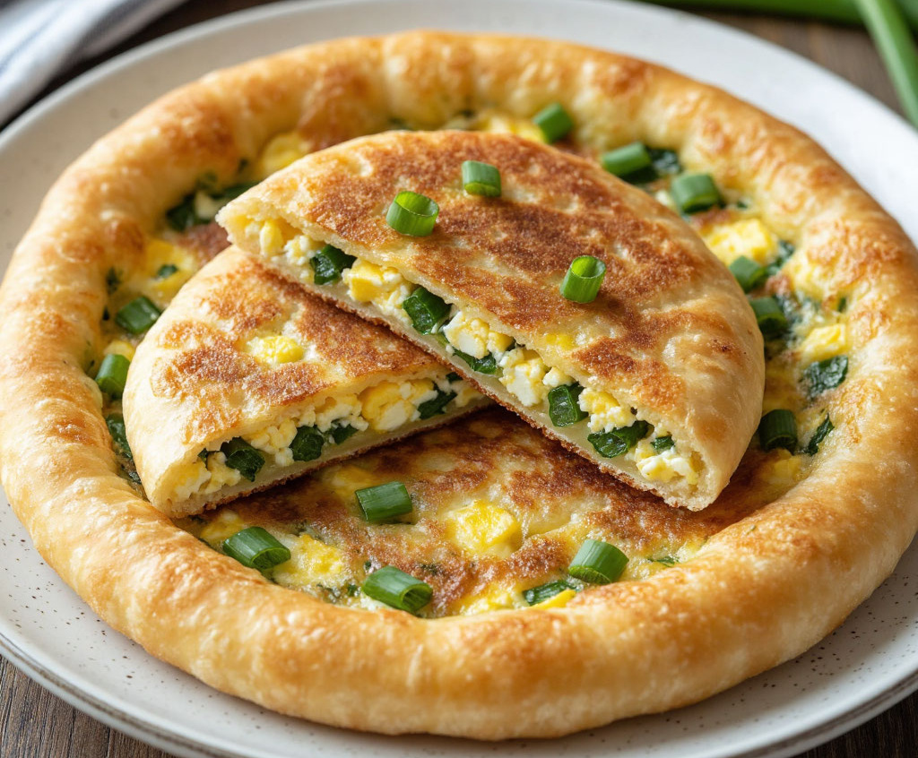 Получается обалденная вкуснятина: хрустящая золотистая лепешка снаружи и сочная, ароматная начинка из взбитых яиц с зеленым луком внутри, которая скрепляет все воедино.