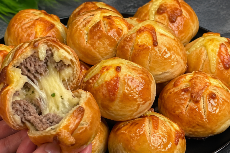 Шарики получаются с хрустящей слоёной оболочкой, внутри — сочный фарш с ароматным луком, а в центре — нежное картофельное пюре с тянущимся сыром.
