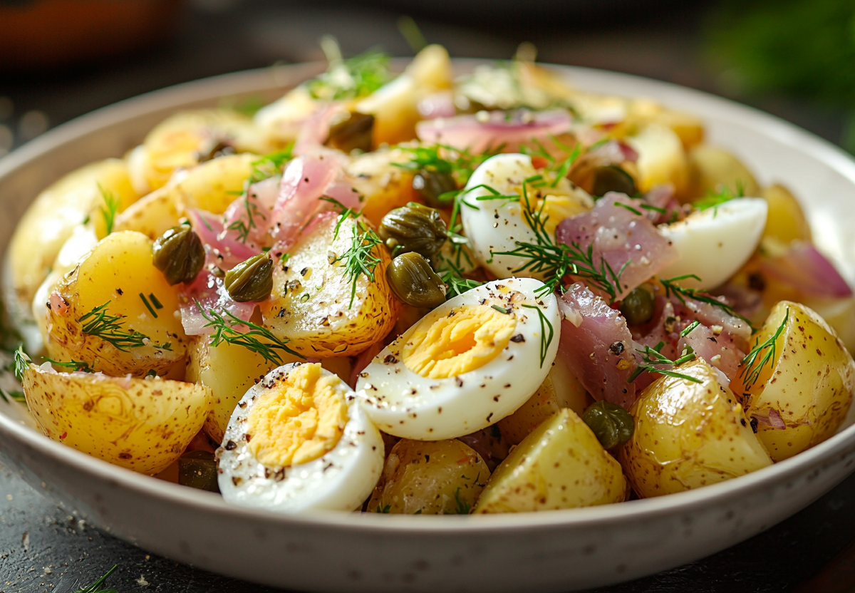 Картошку тщательно вымойте и сварите в мундире до готовности. Яйца варите 8 минут, затем в ледяную воду. Заправка: смешайте горчицу, лимонный сок, масло, соль и перец, добавьте мелко нарезанный лук и корнишоны. Теплую картошку очистите, нарежьте кубиком и перемешайте с заправкой. Яйца очистите, нарежьте дольками и аккуратно добавьте к салату. Подавайте сразу, пока тепло сохраняет аромат и вкус.