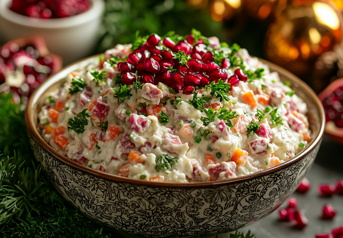 Вкус получается насыщенным и сбалансированным: нежная говядина, свежая редька, сладковатая морковь и сливочная заправка создают гармонию, а зерна граната добавляют сочные сладковато-кислые ноты и праздничный вид. Это сытное и эффектное блюдо для любого застолья.