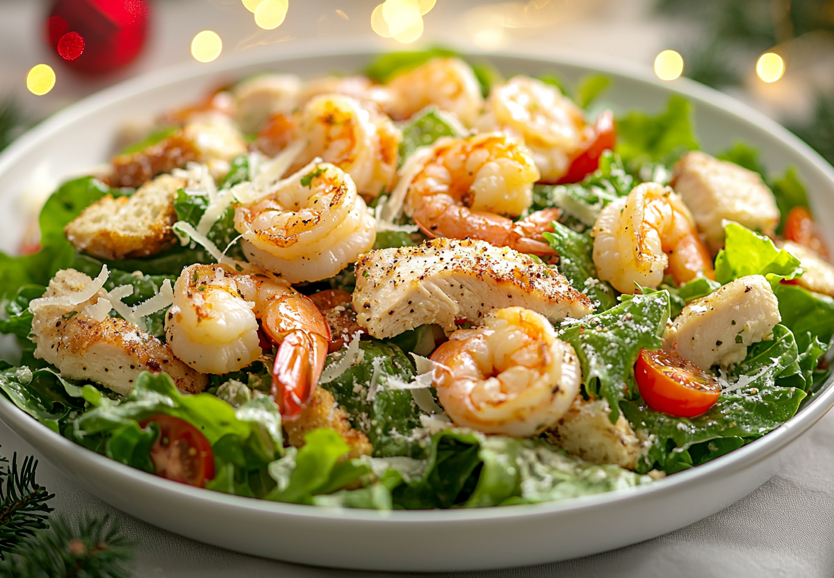 Ингредиенты: куриная грудка — 300 г, креветки очищенные — 200 г, салат романо — 1 кочан (150–200 г), помидоры черри — 150 г, яичные желтки — 2 шт., оливковое масло — 100 мл, анчоусы — 4–5 филе, дижонская горчица — 1 ч. л., лимон — 1/2 шт., чеснок — 1 зубчик, пармезан — 50 г, белый хлеб — 100 г, соль, перец — по вкусу.
