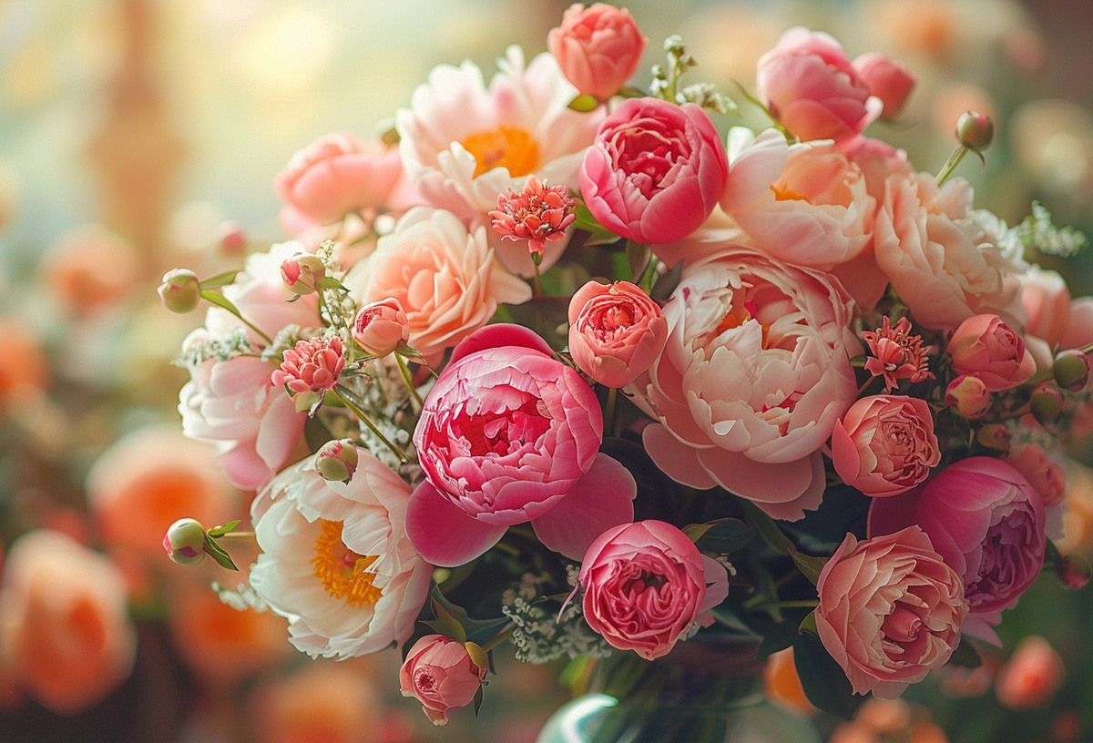В первую очередь речь пойдет о пионах. Эти пышные и яркие цветы являются символом любви и счастья, они долго стоят в вазе и источают приятный аромат.