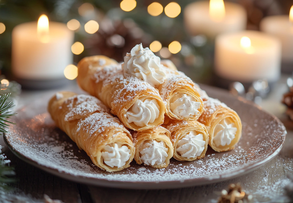 Как приготовить: слоеное тесто разморозьте и нарежьте длинными полосками шириной примерно 1,5–2 см. Каждую полоску аккуратно намотайте спиралью на свернутый пергамент, формируя трубочку. Выложите заготовки на противень и выпекайте в разогретой до 200 °C духовке 12–15 минут до золотистой корочки. Полностью остудите и аккуратно снимите пергамент. Сливки охладите и взбейте с сахарной пудрой до устойчивых пиков. Переложите крем в кондитерский мешок и наполните хрустящие трубочки. Подавайте сразу — это быстро, красиво и удивительно вкусно.