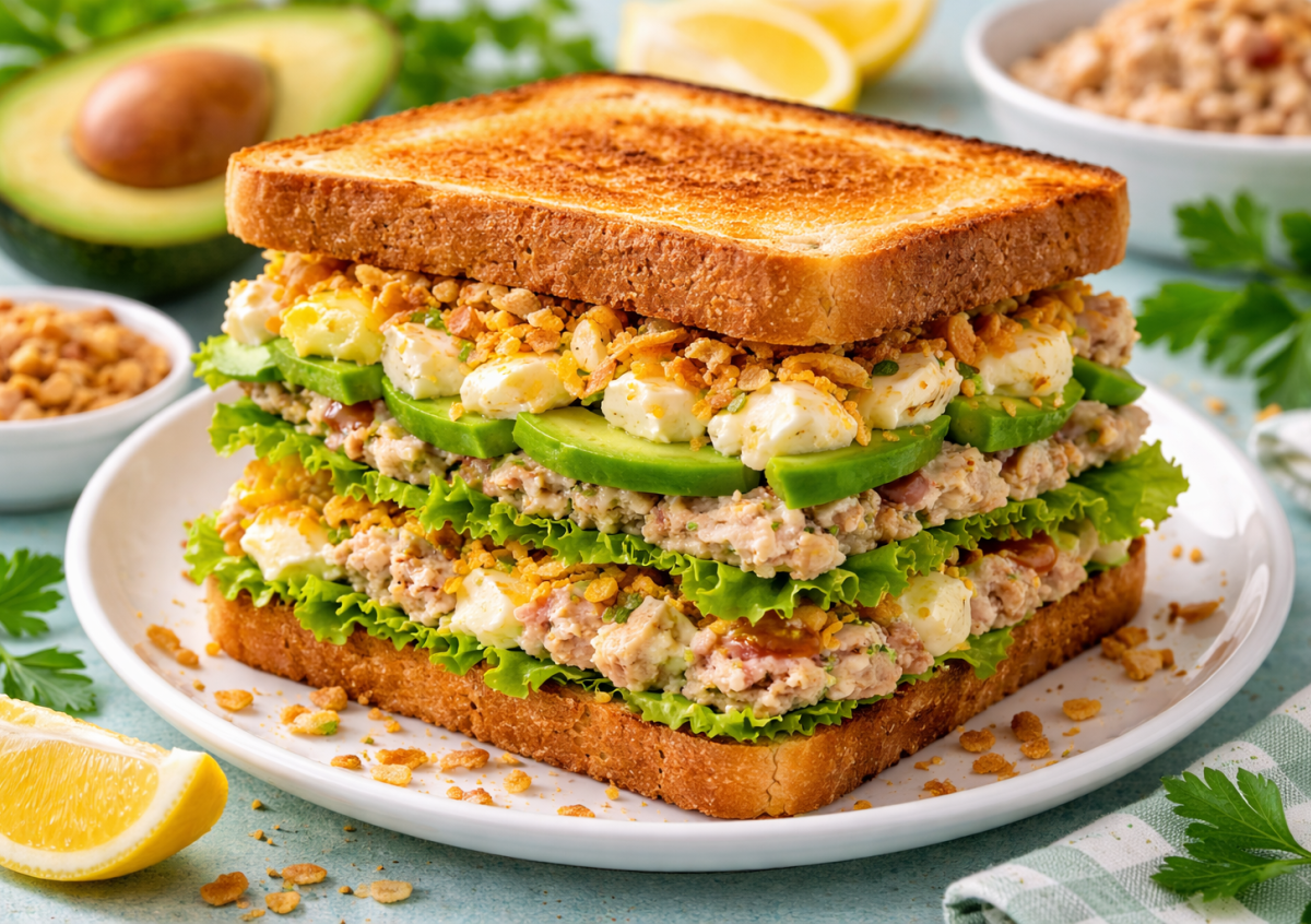 Хлеб поджарить до румяной корочки. Тунец размять вилкой, смешать с майонезом и сладким чили. Авокадо нарезать тонкими ломтиками или слегка размять со щепоткой соли и лимонным соком. Яйцо натереть или мелко нарезать и добавить немного майонеза для нежности. На нижний тост выложить листья салата, щедрый слой тунца, затем яйцо, авокадо и посыпать сушеным жареным луком для хруста. Накрыть вторым ломтиком и слегка прижать.