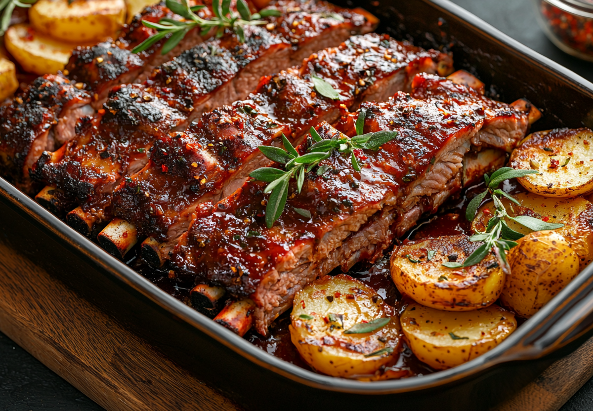 Рецепт: возьмите 1 кг свиных ребер, нарежьте порционно и обмажьте смесью из 2 ст. л. горчицы, 1 ч. л. паприки, соли и перца по вкусу. 6–8 картофелин среднего размера нарежьте дольками. В рукав для запекания выложите ребра и картошку, добавьте 3 зубчика чеснока и веточку розмарина. Плотно завяжите рукав, сделайте несколько проколов сверху и запекайте 1,5 часа при 180 °C. За 15 минут до готовности разрежьте рукав для образования румяной корочки.