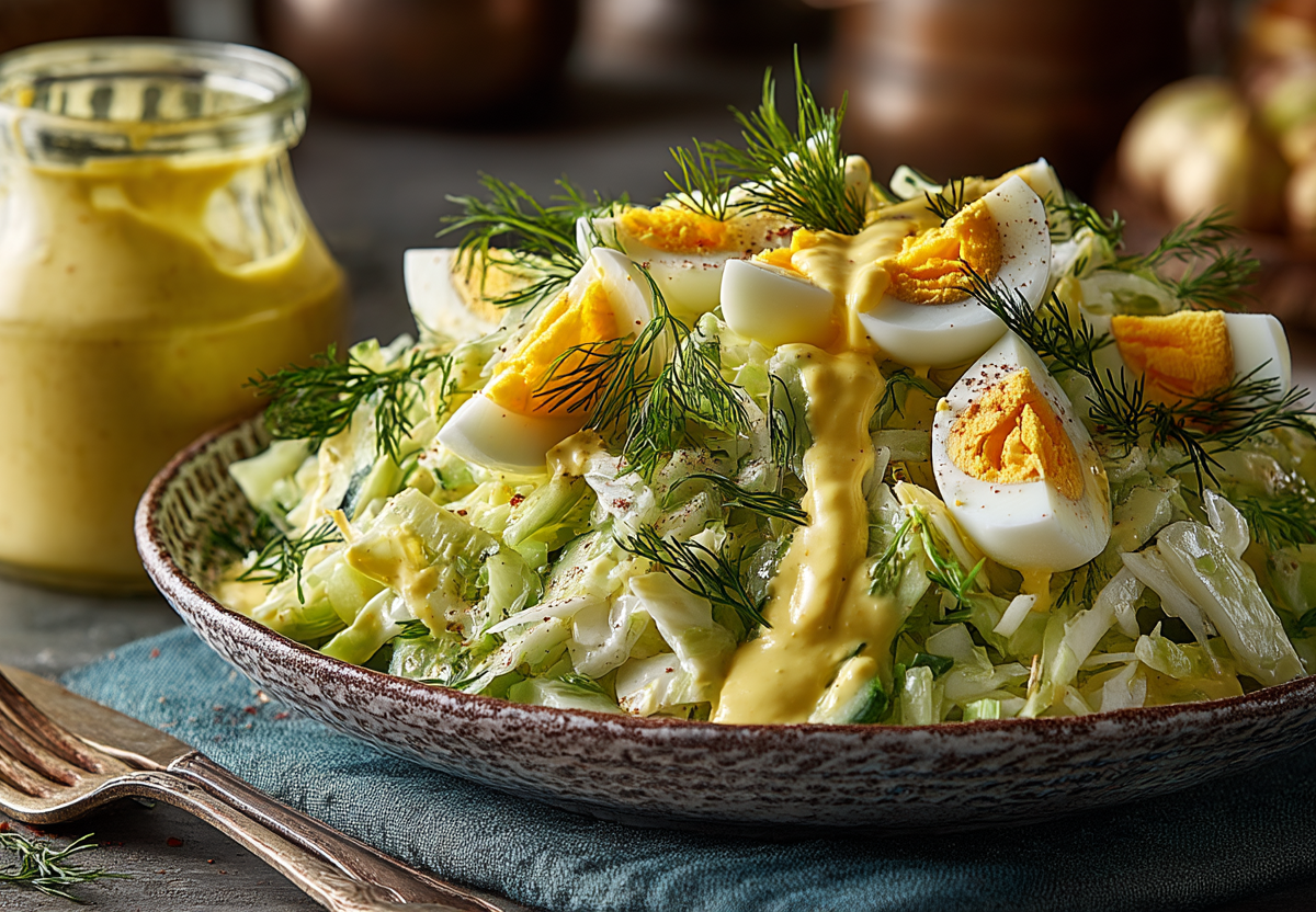 Приготовьте заправку: к размятым желткам добавьте сметану, горчицу, пропущенный через пресс чеснок, соль по вкусу и мелко нарезанный укроп. Перемешайте до получения однородного крема.