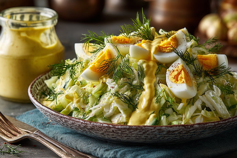 Для приготовления понадобится: 300 г пекинской капусты, 2 свежих огурца, 4 вареных яйца. Для заправки: желтки от вареных яиц, 150 г сметаны (15–20%), 1 ч. л. горчицы, 1–2 зубчика чеснока, соль, свежий укроп.