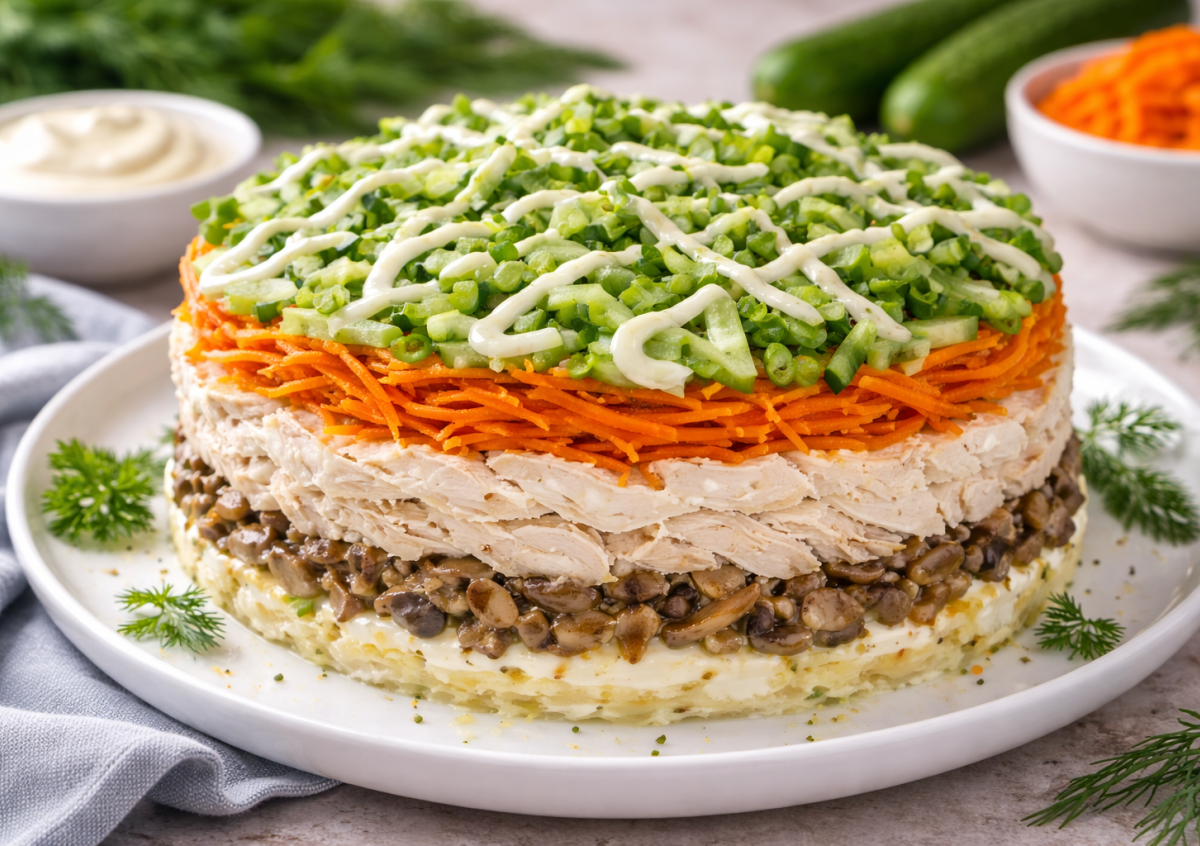 Ингредиенты: свежие шампиньоны — 300 г, лук — 1 крупная луковица, куриное филе — 200 г, корейская морковь — 150 г, свежие огурцы — 2 шт. (если небольшие), майонез — 80–100 г.