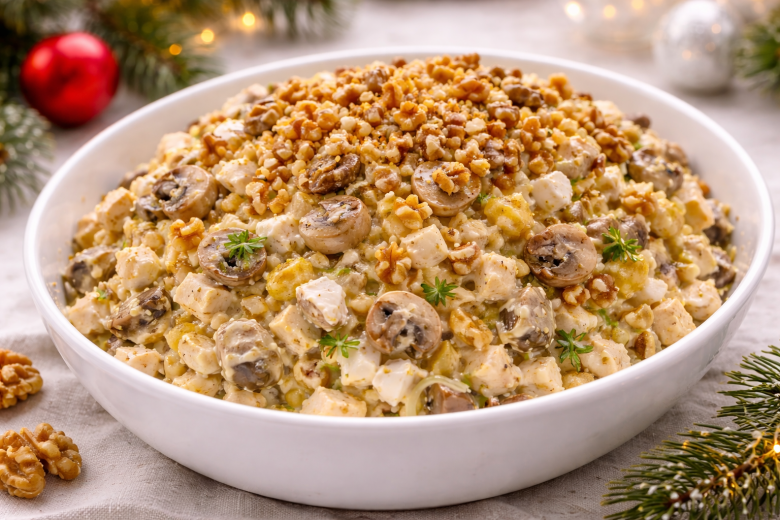 Ингредиенты: отварное куриное филе 250 г, маринованные шампиньоны 200 г, яйца отварные 4 шт., репчатый лук 1 шт., грецкие орехи очищенные 80 г, майонез 200 г, соль и чёрный перец по вкусу, растительное масло для жарки.