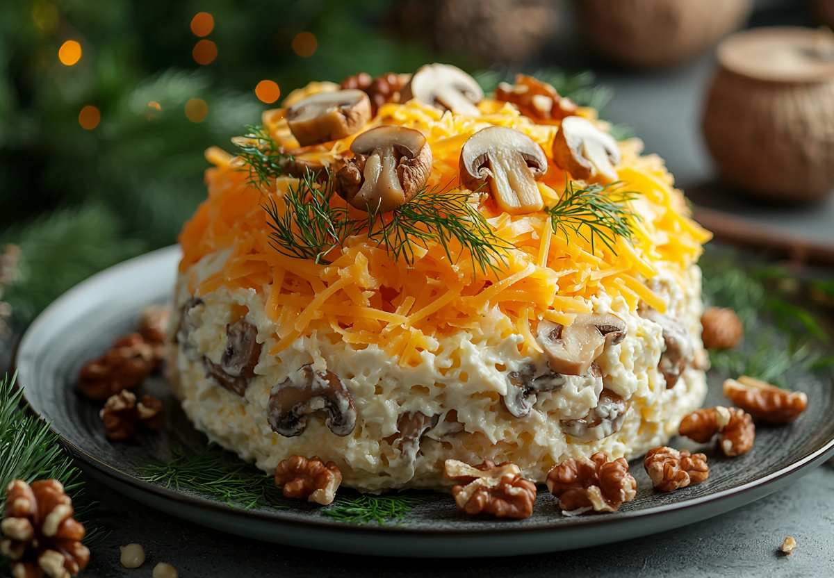 Встречайте Новый год с новым салатом «Сказка». Это настоящая симфония: нежная курица, пикантные грибы, свежесть зелени и хрустящие орехи, объединенные нежным соусом и сырной шапкой. Изобилие вкусов на одной тарелке!