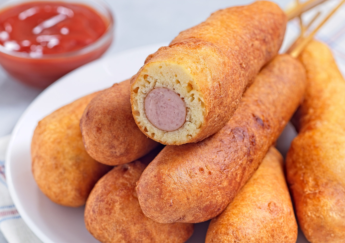 Жареные сосиски в кляре можно подавать горячими или теплыми с соусом из сметаны и зелени, кетчупом или сладкой горчицей.