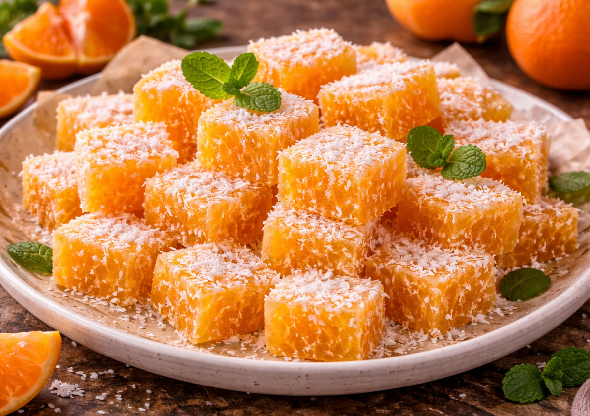 Ингредиенты: мандарины — 6–7 шт., желатин — 15 г, сахар — 2–3 ст. л. (по вкусу), вода — 100 мл, кокосовая стружка — для обсыпки.