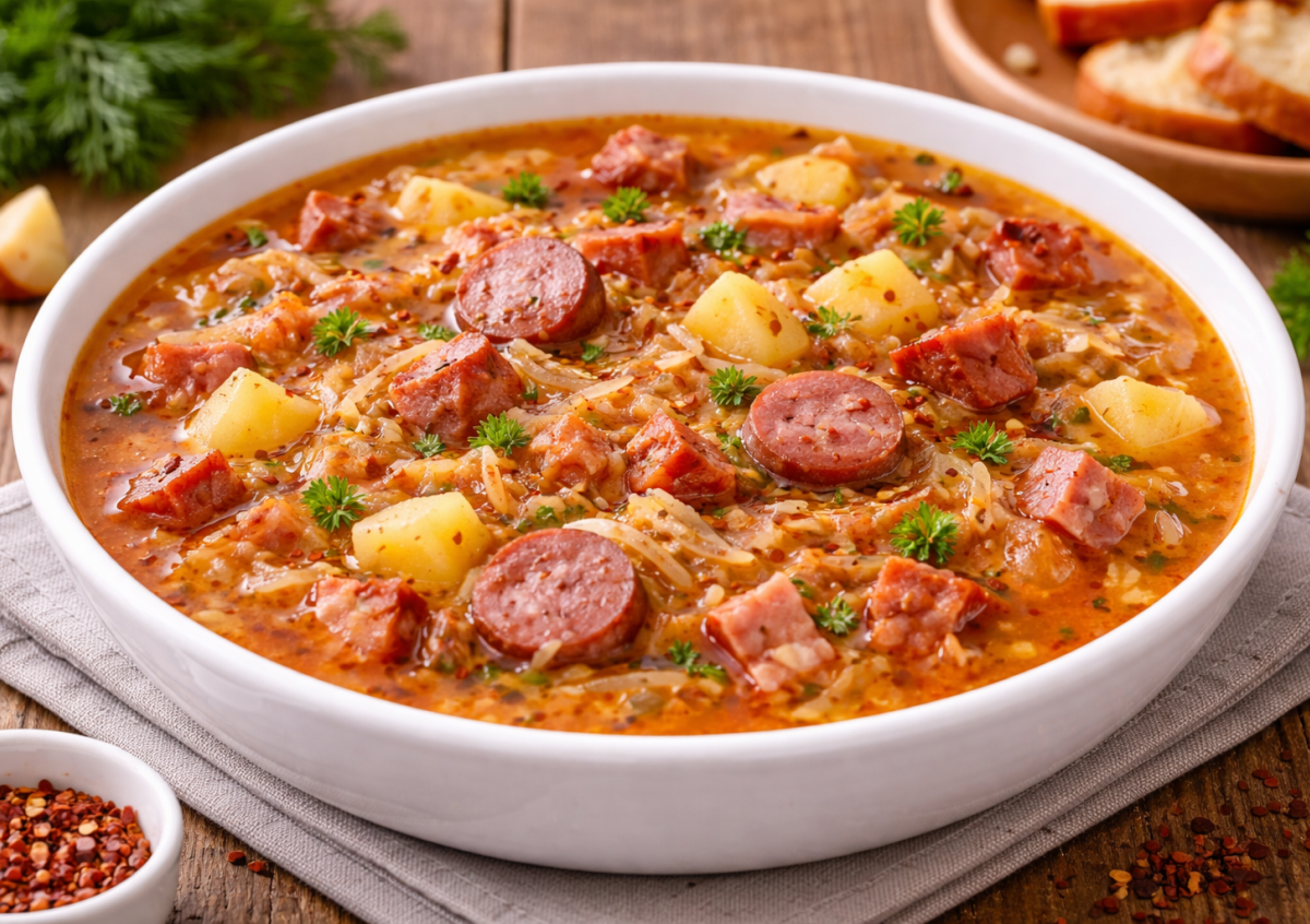 Когда хочется чего-то домашнего, наваристого и ароматного, я варю суп с квашеной капустой и копченостями. Он получается густым, насыщенным и очень аппетитным. Кислинка капусты отлично сочетается с дымным вкусом мяса, а картофель делает суп более сытным и мягким по вкусу. Такой суп особенно хорош в прохладную погоду — тарелка согревает буквально с первой ложки.