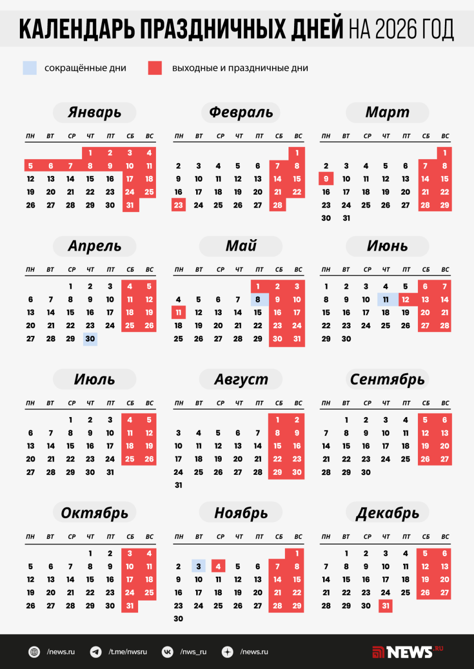 Подробнее о том, как россияне будут отдыхать в 2026 году, — в инфографике NEWS.ru.