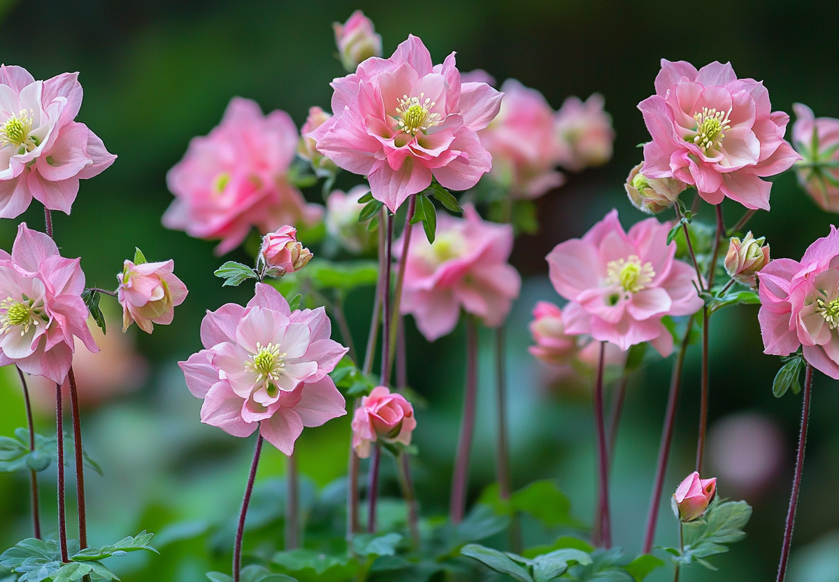Аквилегия Нора Барлоу — это изысканный махровый сорт аквилегии, который покоряет садоводов своим романтичным видом и неприхотливостью. Растение формирует компактные кусты высотой до 60–80 см с ажурной сизо-зеленой листвой, над которыми возвышаются прочные цветоносы с густомахровыми цветками диаметром 5–6 см. Лепестки окрашены в нежно-розовые тона с контрастными белыми кончиками, что придает им сходство с миниатюрными розами или пионами. Цветение длится с мая по июль, а при своевременном удалении увядших бутонов может повториться в конце лета.