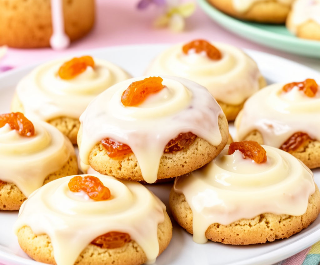 Для глазури смешайте пудру с лимонным соком, постепенно добавляя молоко до густой консистенции. Нанесите глазурь на печенье, сверху положите кусочки кураги. Это печенье — идеальный пасхальный десерт к чаю.
