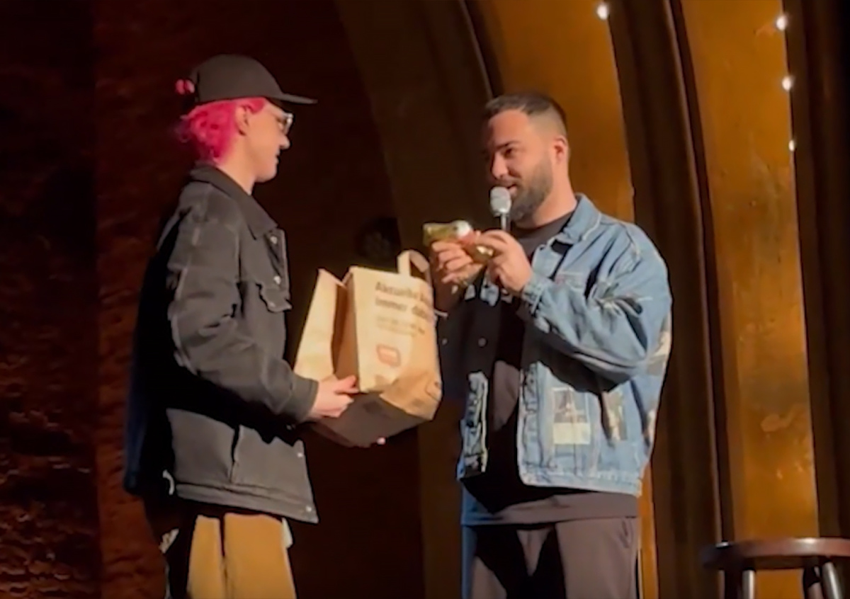 Утром 5 апреля по отечественным Telegram-каналам разлетелось видео с концерта российских стендаперов. По сюжету выступления Долгополов, изображавший девушку в розовом парике, вручил Оганисяну небольшую статуэтку, на что последний ответил фразой: «Реально статуэтка? Спасибо огромное, спасибо большое. Отлично. Пусть постоит здесь».