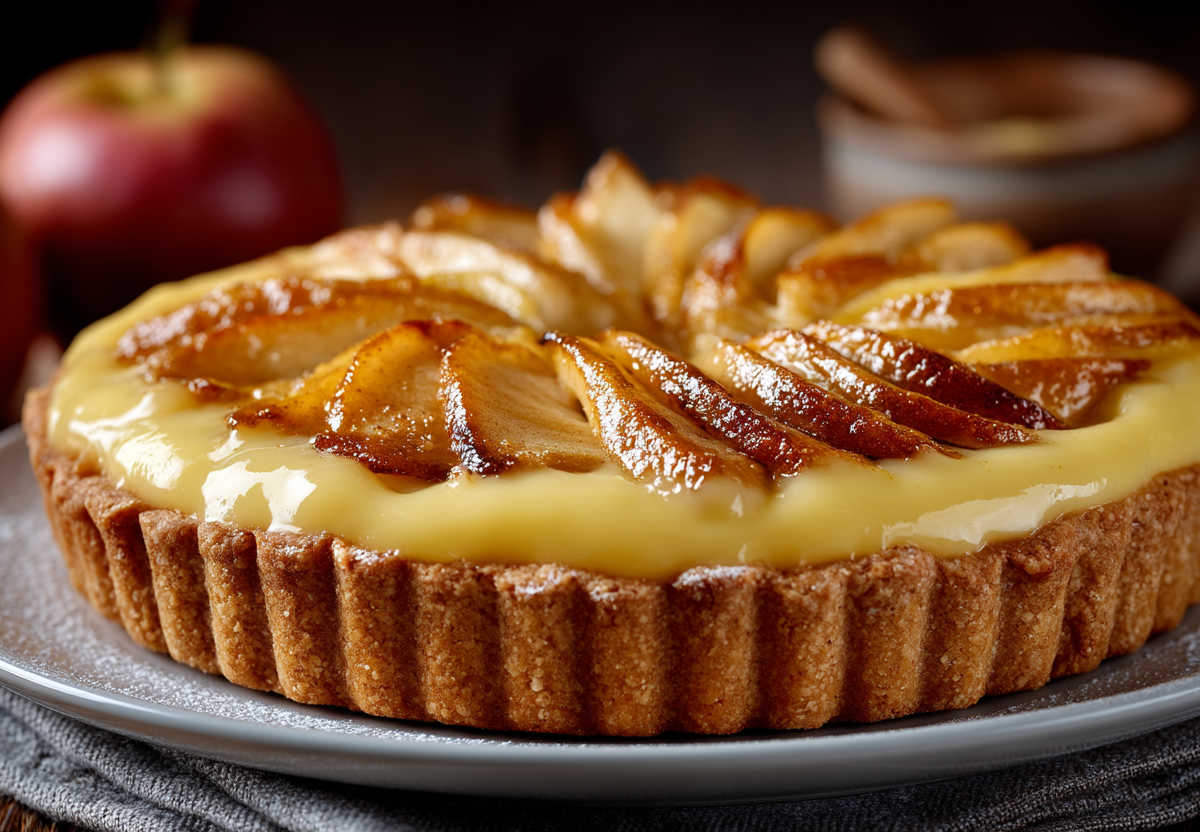 Открыт рецепт идеального яблочного пирога с заварным кремом — десерта с тонкой хрустящей основой и большим количеством невероятно нежной кремовой начинки.
