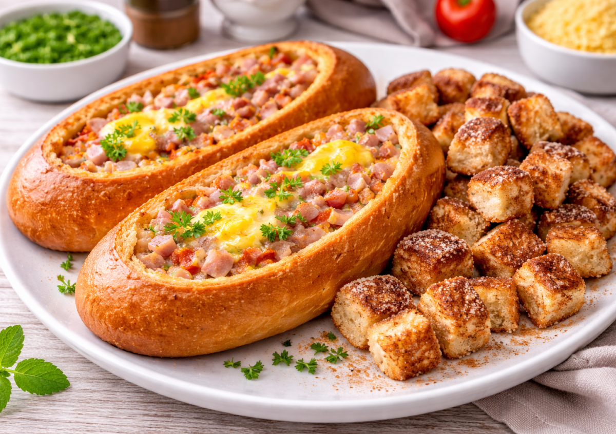 Иногда достаточно одного батона, чтобы приготовить сразу два разных завтрака. Сытный — с яйцами, сыром и колбасой, и сладкий — ароматные гренки на сливочном масле с сахаром и корицей. Получается удобно, быстро и очень вкусно. Такой завтрак любят и взрослые, и дети — особенно когда на тарелке сразу два варианта.