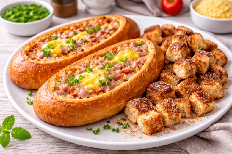 Секрет в том, что батон используется полностью. Из половинок получается аппетитная «лодочка» с начинкой, а мякиш превращается в сладкие хрустящие гренки.